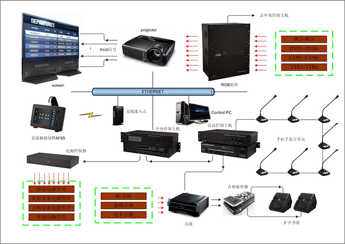 根据会议室的情况,应用智能中央控制系统来实现智能化的控制。整个办公室需要使用中央集中控制的方式进行控制,自行修改用户界面、以及功能要求,采用一个无线WiFi触摸屏进行系统控制,分别对会场中的投影显示,灯光,音响,会议系统设备以及矩阵切换器进行集中控制。中控主机与WIFI触摸屏直接通讯方式完全支持双向的WIFI技术,在无线彩色触摸屏上,需要对整个系统的主要功能进行控制。在有线触摸屏ITCLBW35上对主要灯光系统以及预设模式进行调整,从而实现智能化控制的目的