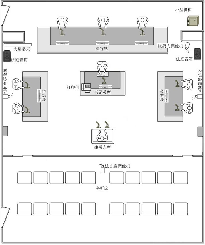 中法庭通常也是法院中的主力审判庭,对庭审过程的当官、当事人、嫌疑人等均能清晰拍摄、记录、存储等要求,并具有远程开庭、远程提讯功能,因此刑事法庭按照全高清的法庭进行相关设计。