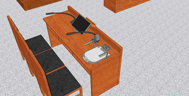 在书记员席位配置1台电脑,书记员电脑除可控制、笔录庭审外,还可为原告、被告人等提供各种形式的证据播放平台,如USB存储介质音频、电子录音、手机录音等,或案件信息管理系统、书记员、当事人、互联网等的证据展示。