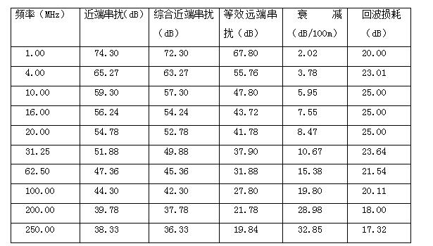根据TIA/EIA和ISO/IEC标准的要求,须对选型的六类非屏蔽双绞线进行电气性能和传输特性的测试。选用的六类非屏蔽双绞线满足或者优于以下表内频率、近端串扰、综合近端串扰等参数的要求: